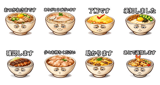 仕事の連絡に使える、疲れ顔どんぶりの敬語スタンプセットです。