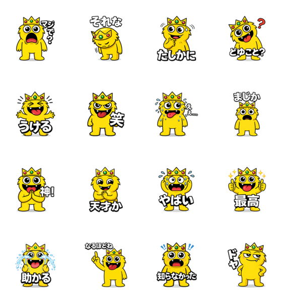 黄金色のモンスター王、第3弾はリアクション特化!「マジで?」「それな」「神!」など、トークを盛り上げる現代的なフレーズが満載です。