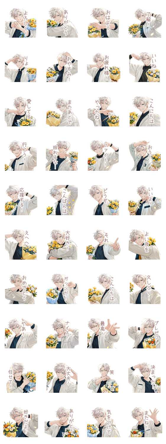 花束と白髪男子スタンプ -LINEスタンプマニア