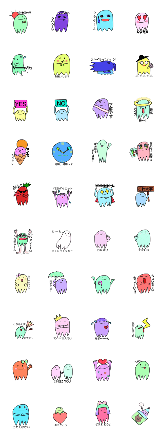 | スタンプ説明 | イカみたいなオバケみたいな可愛いスタンプです!ゆるくいろんな所で使えるようなモノを作りました!ぜひ! |