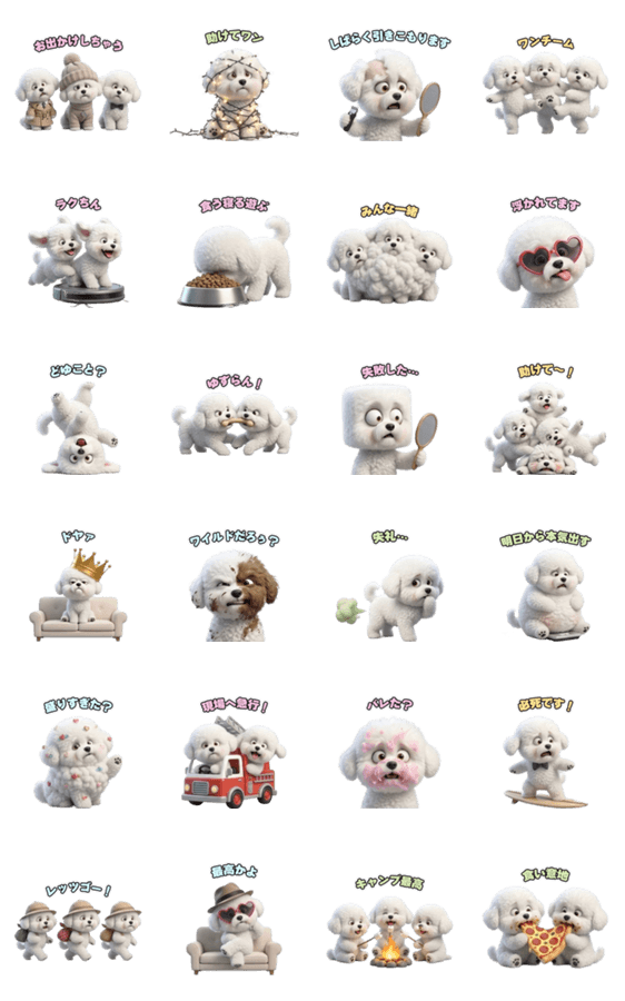 ふわふわな3匹のビションフリーゼが、豊かな表情で登場!コミカルなポーズや愛くるしい仕草で、毎日のトークを賑やかに盛り上げます。犬好きさん必見です!