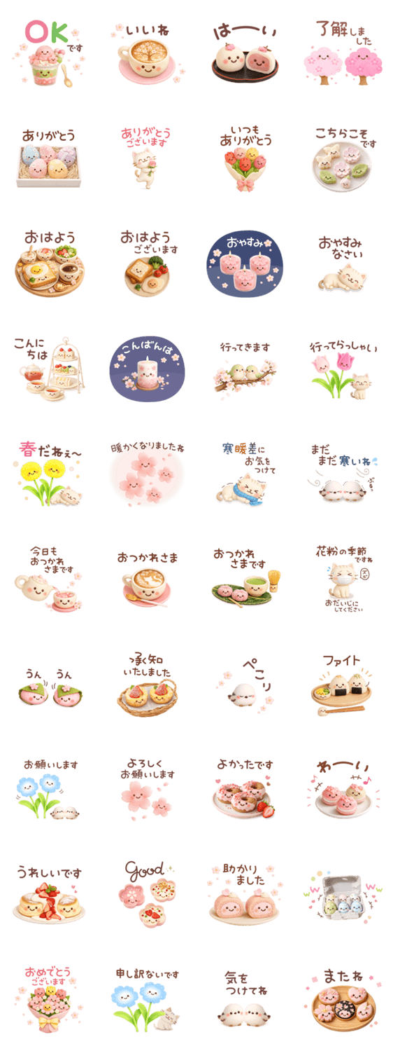春・桜・スイーツ♡がいっぱい♪ねこ・うぐいす・シマエナガも登場するよ♡ 春のあいさつや日常トークにぴったりの、ふんわり可愛いスタンプです。毎年使えて便利♪