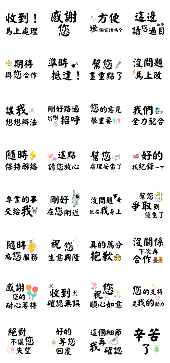 | スタンプ説明 | 外回り中で入力する時間がない?このスタンプにお任せ!大事な連絡もワンタップで完結し、仕事の効率が劇的にアップします。 |