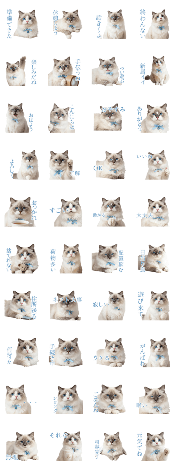 | スタンプ説明 | 聞き上手ラグドール猫が新生活を応援。引越し準備や手続き、住所連絡から毎日の挨拶まで。全肯定で優しく癒します。 |