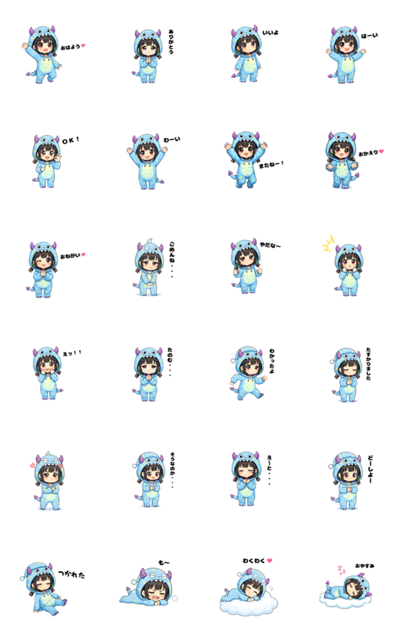モンスターの着ぐるみを着た女の子の、日常で使いやすいスタンプセットです♪