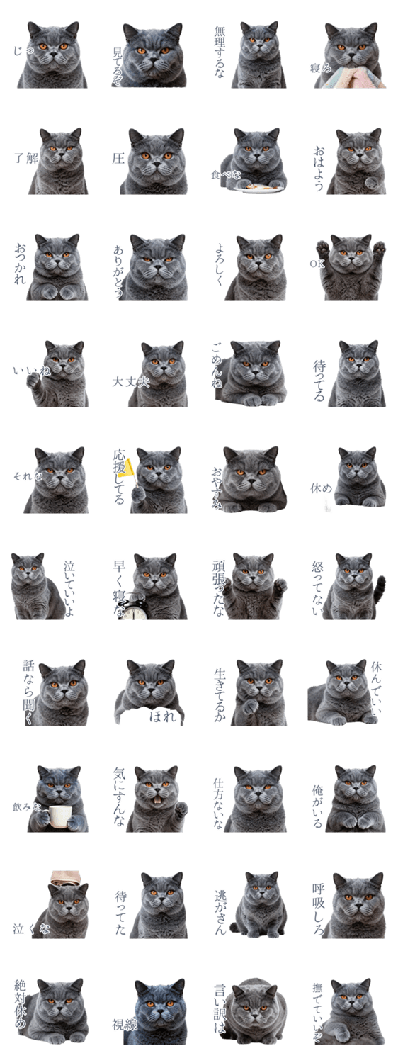 | スタンプ説明 | 丸くてもちもちブリティッシュショートヘアが、無言の圧と不器用な気遣いで見守るシュールなスタンプ。大人かわいい癒やしを、猫好きの友達や家族に送ろう! |