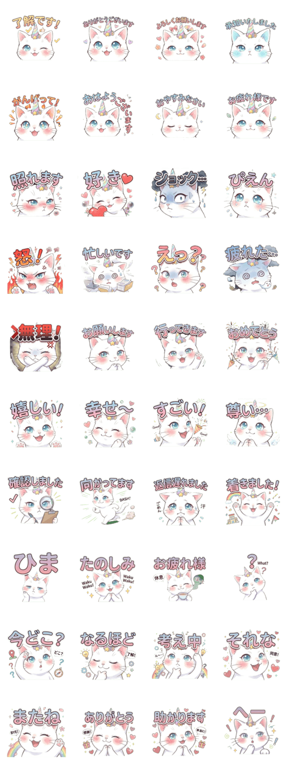 | スタンプ説明 | 虹色ツノの白猫「つのねこシルキー」登場!パステルで優しいタッチ♡挨拶や敬語など毎日の連絡に使いやすい言葉がいっぱいです。お茶目なシルキーに癒されてね♪ |