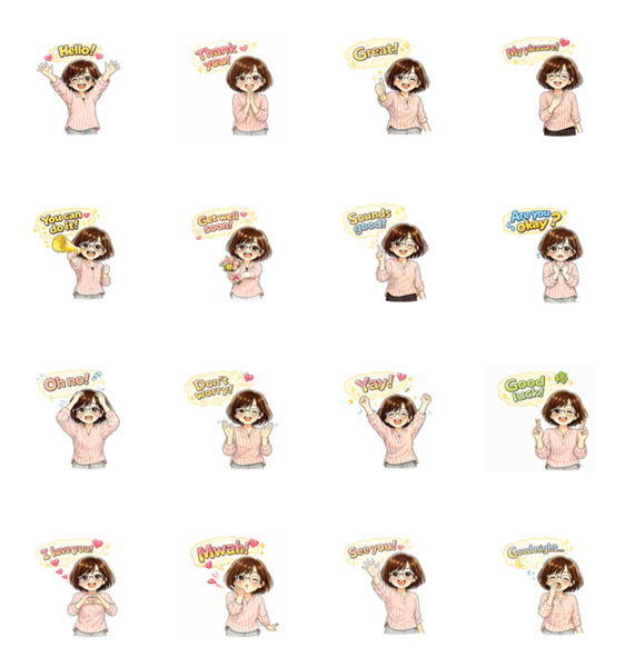Yuri先生の英語スタンプです。 Hello! Thank you!など、毎日使えるシンプルな英語フレーズを集めました。 英語教室や日常のメッセージにどうぞ♪