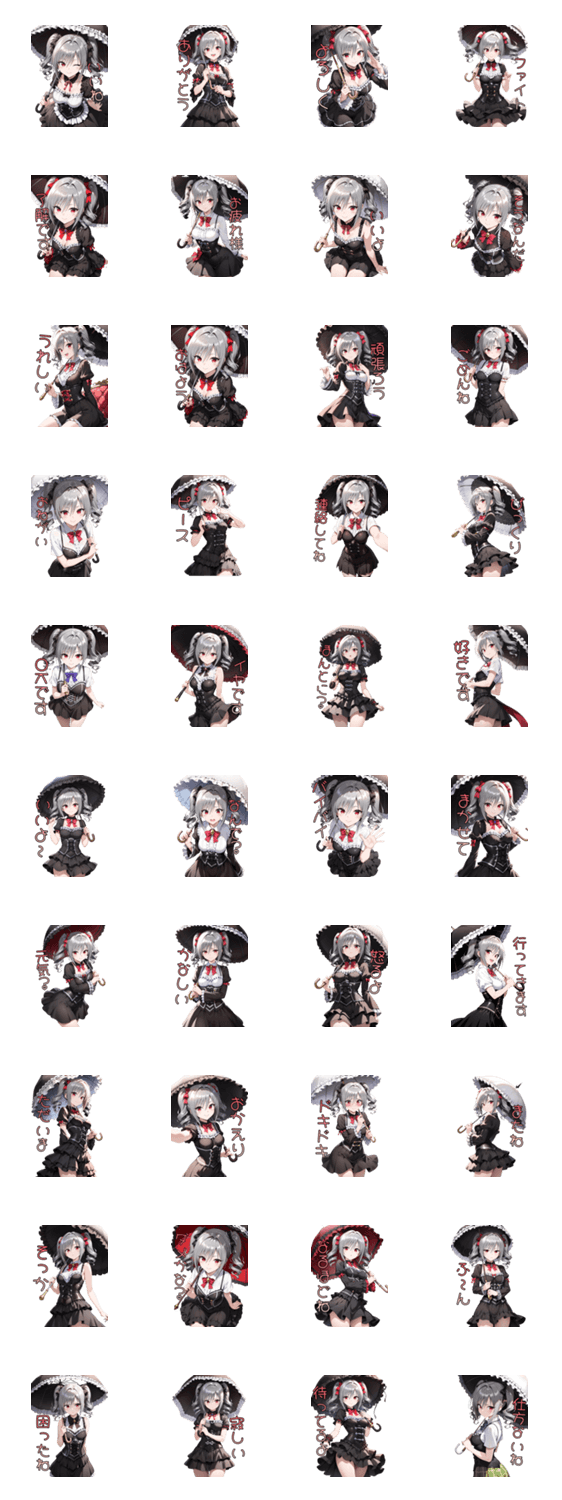 日傘とゴシック衣装で優雅に佇むお姉さん。 ミステリアスで上品な雰囲気と、ほんのり可愛い魅力でトークを彩ります。 落ち着いた大人の優雅さを楽しめるゴシック系スタンプ