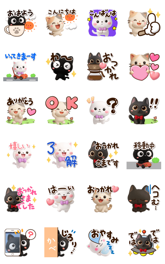 ちびネコスタンプの猫たちの、飛び出す便利なポップアップスタンプです。かわいいねこたちが元気に返事をします。三毛猫や黒猫好きな方にぜひ。【かたこ】