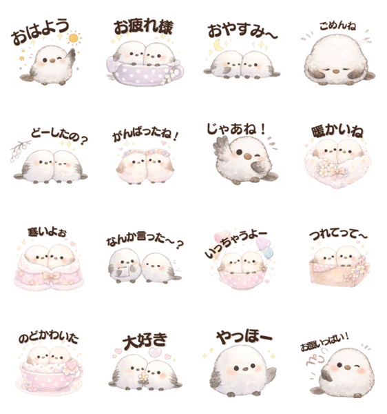 | スタンプ説明 | シマエナガのかわいい癒し系スタンプです。 おはよう・ありがとう・おやすみなど毎日使える言葉がいっぱい。 ほっこりスタンプです。 |