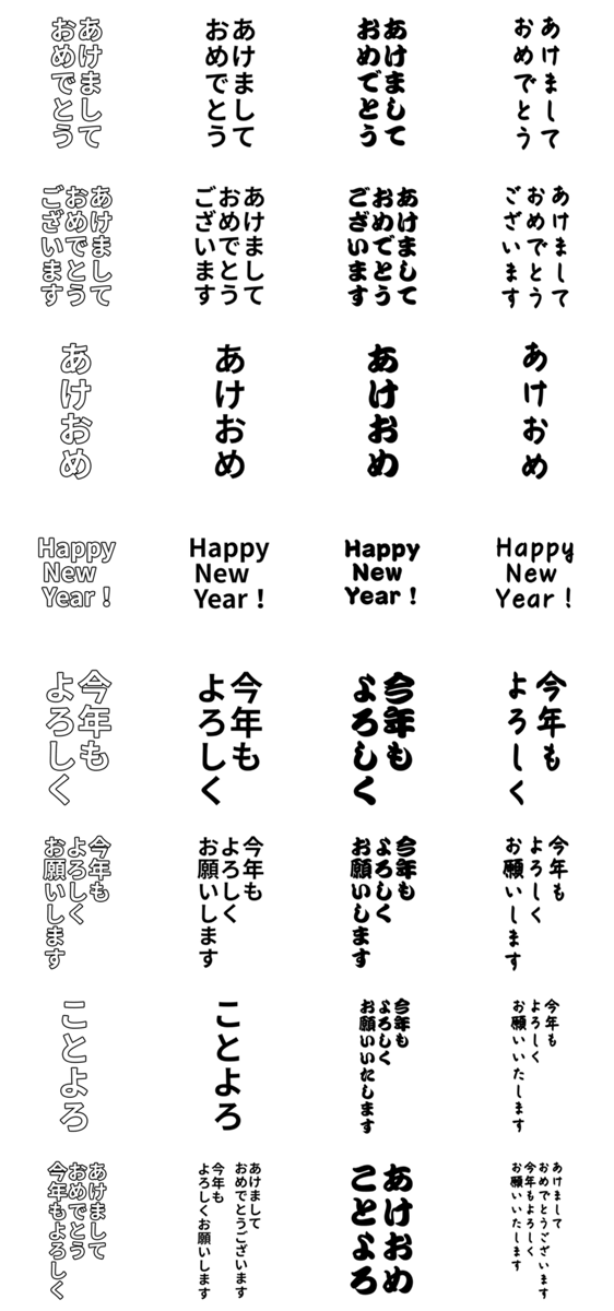 気分によって使い分けできる色々な書体・黒文字は白色縁取り・文字だけBIGスタンプ・文字のみ・敬語有・あけましておめでとうございます・あけおめ・今年もよろしく ※このスタンプはトークルームで大きく表示されるBIGスタンプです。