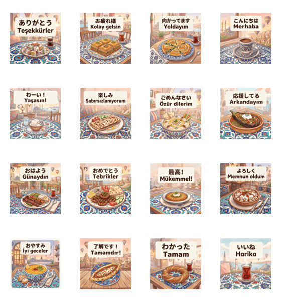 | スタンプ説明 | 手描きのトルコ料理スタンプ!ケバブやチャイで会話を賑やかに。温かい手描きイラストで、トルコの美味しい風を届けよう! |