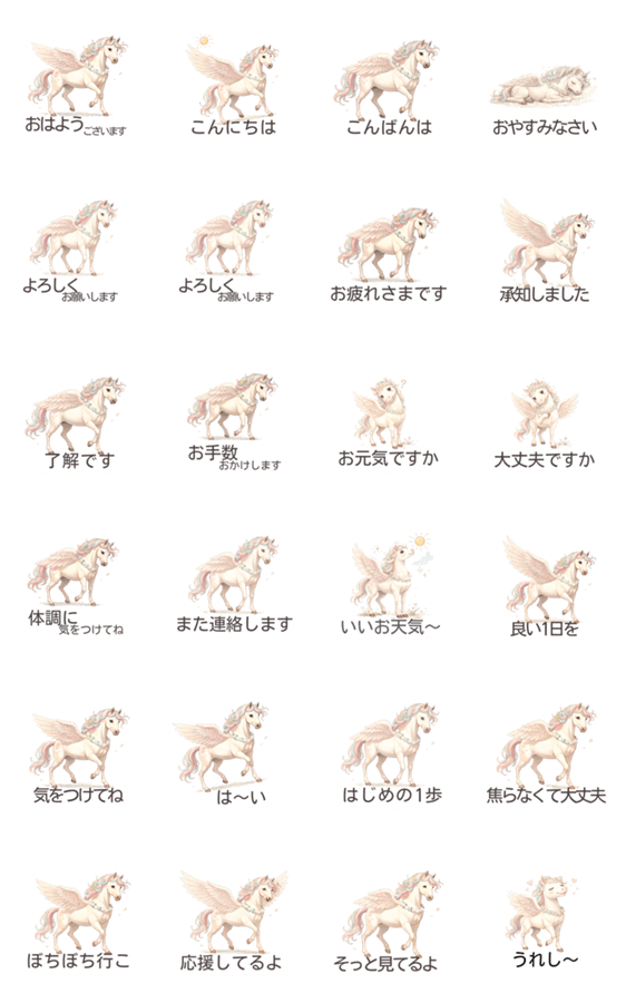 | スタンプ説明 | 仕事でも日常でも使える、やさしい丁寧ことばスタンプ。大人の会話にぴったり。 やさしさ(ピンク) 安心(水色) 希望(黄色) を運ぶペガサス、サーニャ。 |