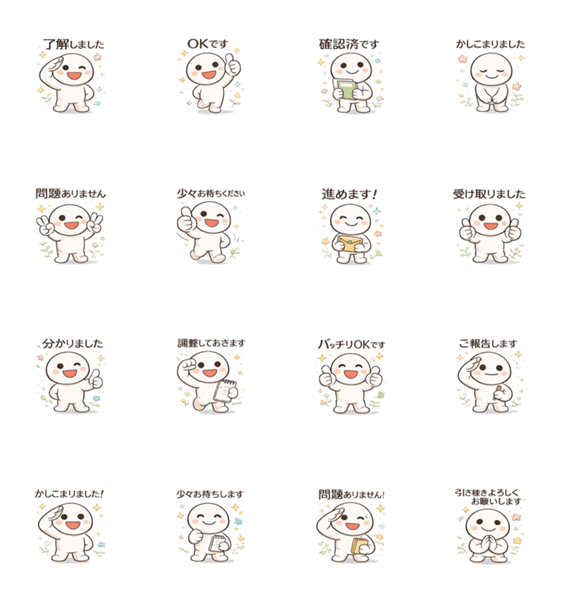 「了解しました」「承知しました」「OK!」など、日常会話からビジネスまで幅広く使える便利なスタンプです。シンプルで見やすく、すぐに返事したいときにぴったりです。