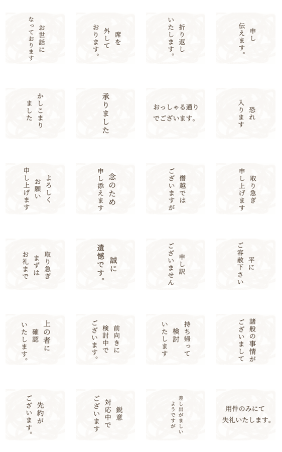 | スタンプ説明 | 「上の者に確認いたします」=夫(妻)にお伺い必要! 「前向きに検討中」=できたら断りたい! 職場でも飲み会でも義実家にも使える、 大人の敬語スタンプ24枚。 |