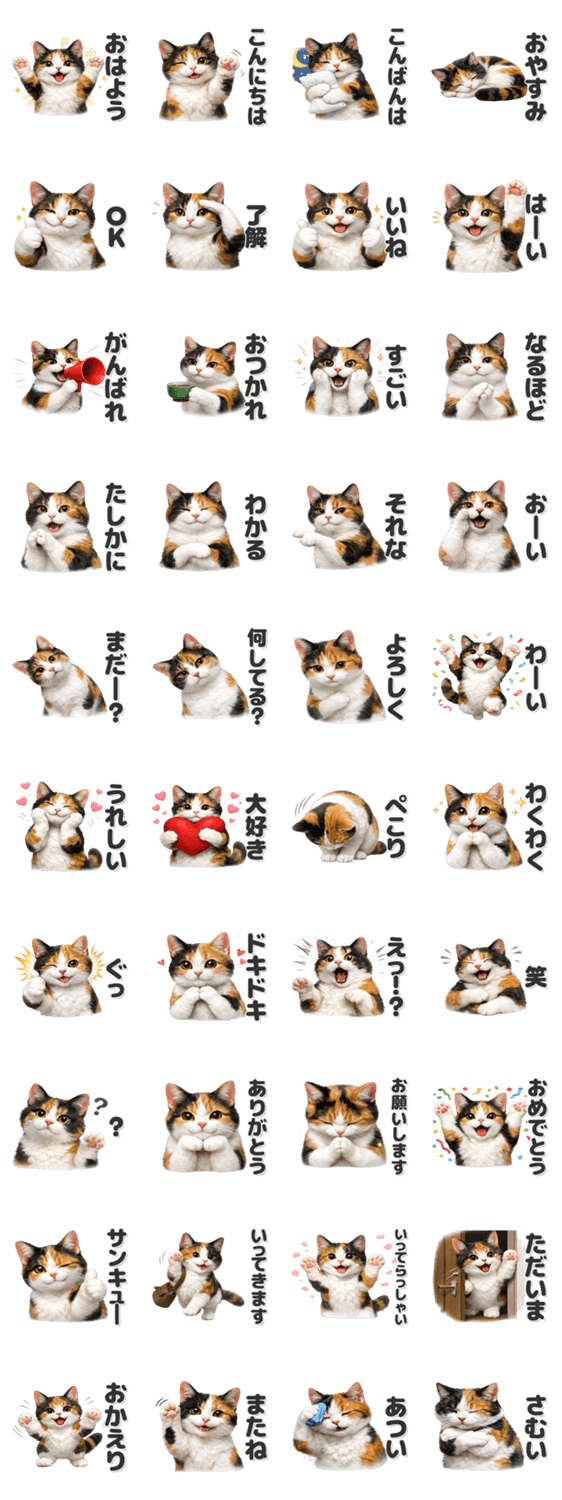 可愛い三毛猫のスタンプです。/猫/ねこ/かわいい/シンプル/日常/使いやすい/動物/癒し/友達/家族/見やすい/便利/返事/まいにち/ほっこり/やさしめ/気軽/定番/自然/親しみ
