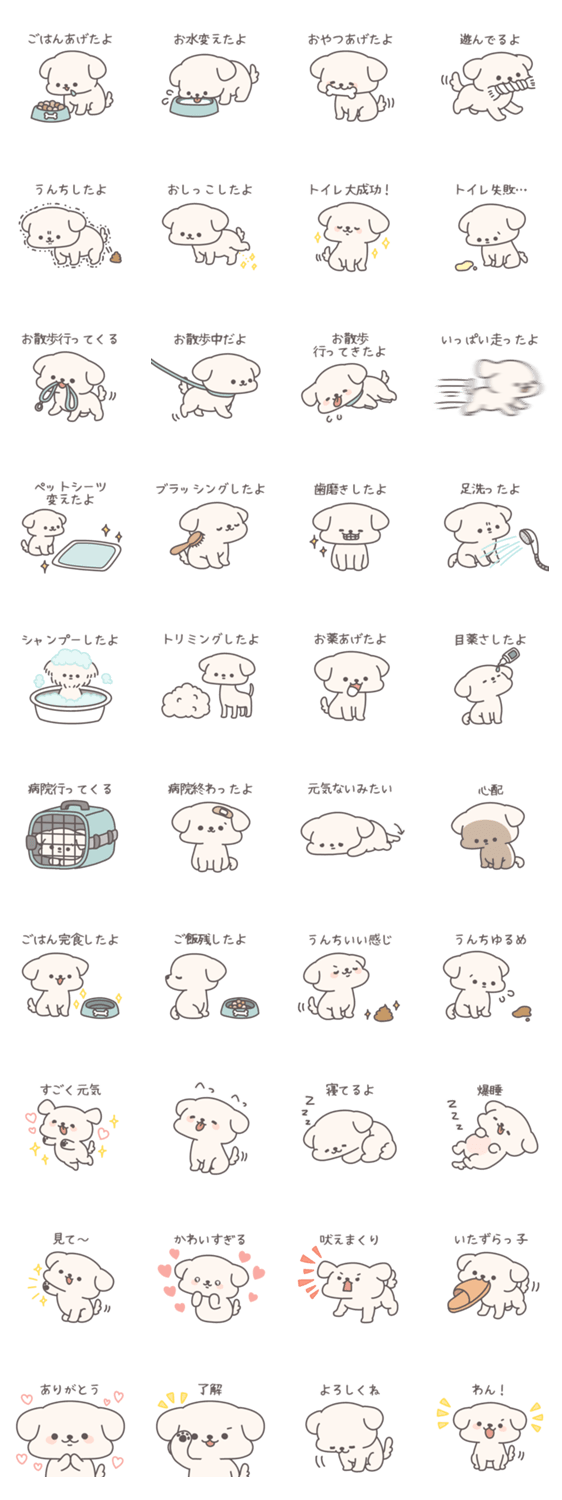 いぬの毎日の様子を伝えるスタンプです。ごはん、散歩、うんち、病院など、わんこのお世話や体調を家族に報告するときに使えます。関連用語:ペット/家族