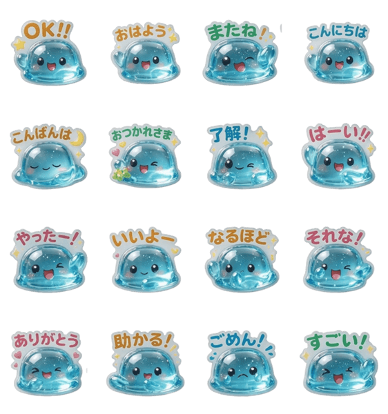 | スタンプ説明 | ぷるぷる透明なゼリーちゃんのゆるかわスタンプ。「おはよう」「こんにちは」「OK」「ありがとう」「ごめん」など日常で使いやすい言葉を収録。ドロップ/うるうる/ボンボン |