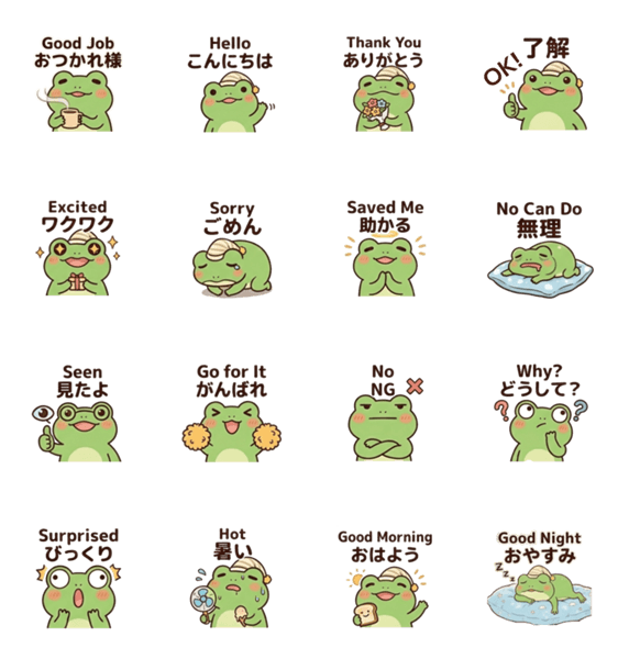 毎日がんばるあなたへ。脱力感あふれるカエルが、ゆる〜く「おつかれ様」を伝えます。送る方ももらう方も、心がホッとする癒やし系スタンプです。