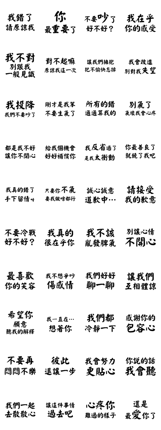 | スタンプ説明 | ケンカの後に使える、心のこもった仲直りスタンプ。大切な人との絆を深めるための魔法の言葉集です。 |