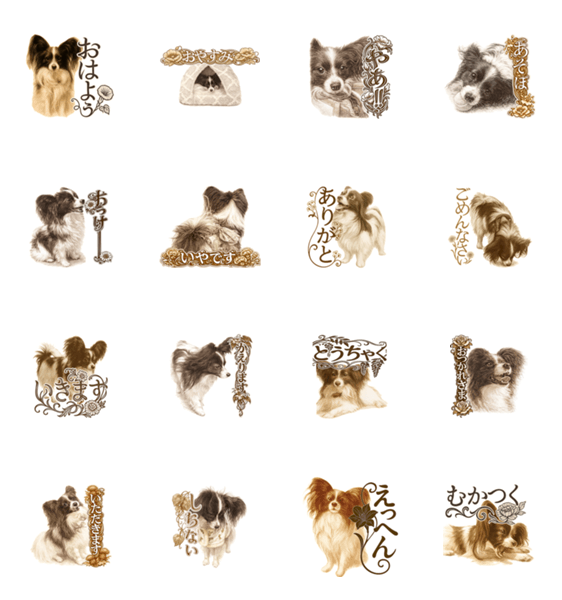 パピヨン「ゆず」の優雅なセピア色ラインスタンプです。
