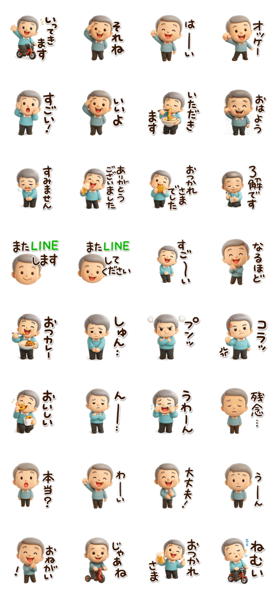 『おじいちゃんスタンプ』の使いやすい3Dドールルックスタンプ。毎日便利に使えるあいさつ等明るいお爺ちゃん。お父さん、じいじへのプレゼントとしてもぜひ。【かたこ】