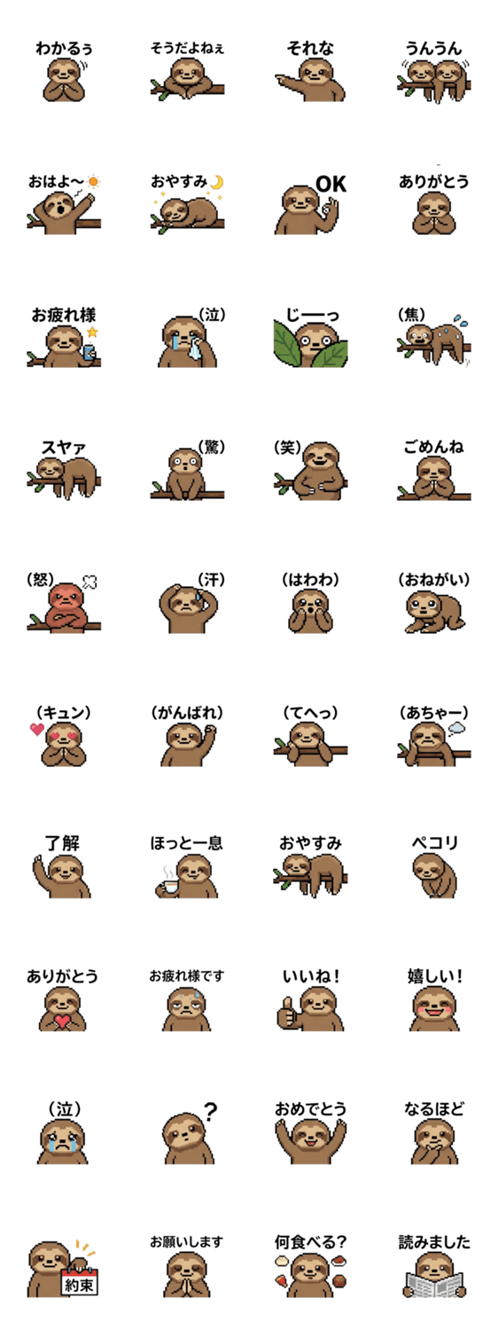 落ち着いたトーンのナマケモノスタンプ。日常の挨拶を優しく伝えます。
