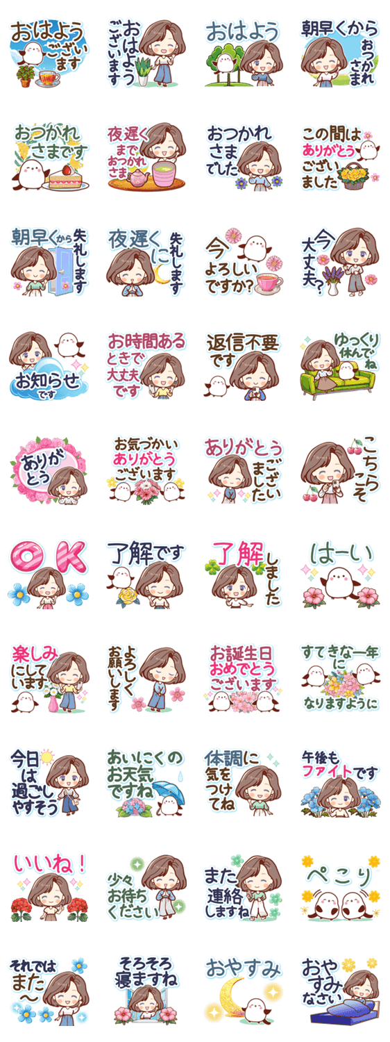 大人女子とシマエナガの、使いやすい大きな文字スタンプです♪ 挨拶/ありがとう/おはよう/おやすみ/よろしく/かわいい/笑顔/連絡/ PTA/役員/女の子/主婦/ママ友/シニア女性