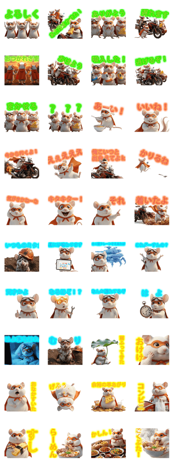 | スタンプ説明 | バイクと現場を愛する3人、冷静「ちゅうタ(データ)」、熱血漢「ちゅうリキ(力)」、マイペース「ちゅうプク(ぷくぷく)」の3匹が、現場や日常を盛り上げます! |