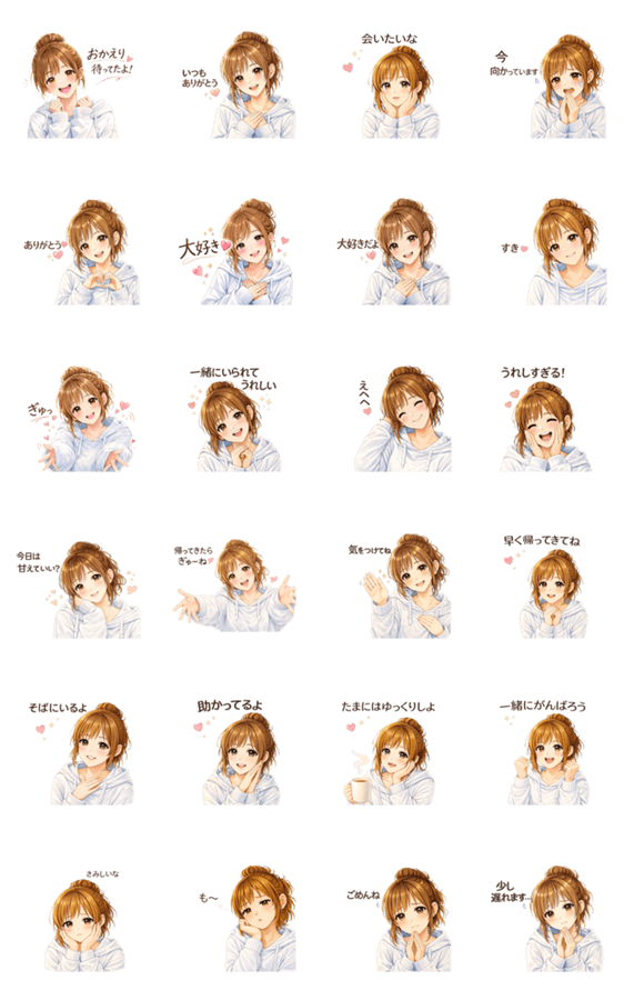 大人可愛いミルクティー女子の恋するスタンプ。「大好き」「会いたいな」など恋人や夫婦で使える言葉をそろえました。やさしい気持ちを届ける、あたたかい日常セットです。