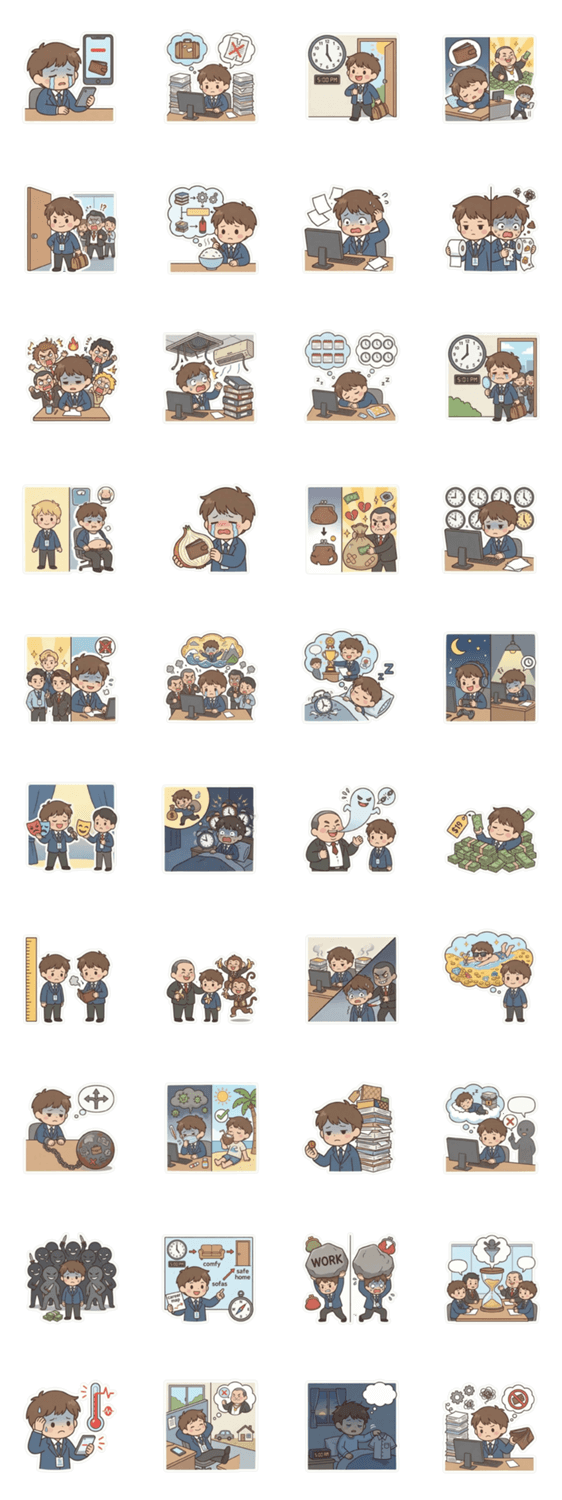 言葉は不要!残業、ストレス、理不尽な仕事に疲れ果てた会社員「ルー」の文字なしスタンプ。あなたの限界な気持ちを、言葉を使わずに代弁します。毎日頑張るあなたに!