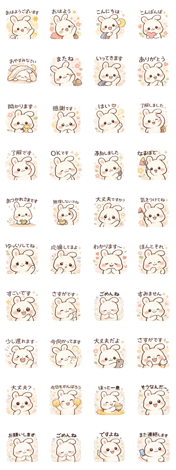 ふわふわうさぎ「ふわりん」の毎日使える日常スタンプ。ふわふわうさぎのママ友、家族、お仕事にも使える、大人かわいいやさしいスタンプです。