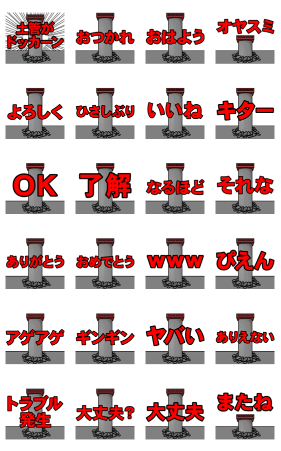 土管がドカーンと出てきてついでにメッセージを伝えるシュールなスタンプです。メッセージは普通に使いやすいです。