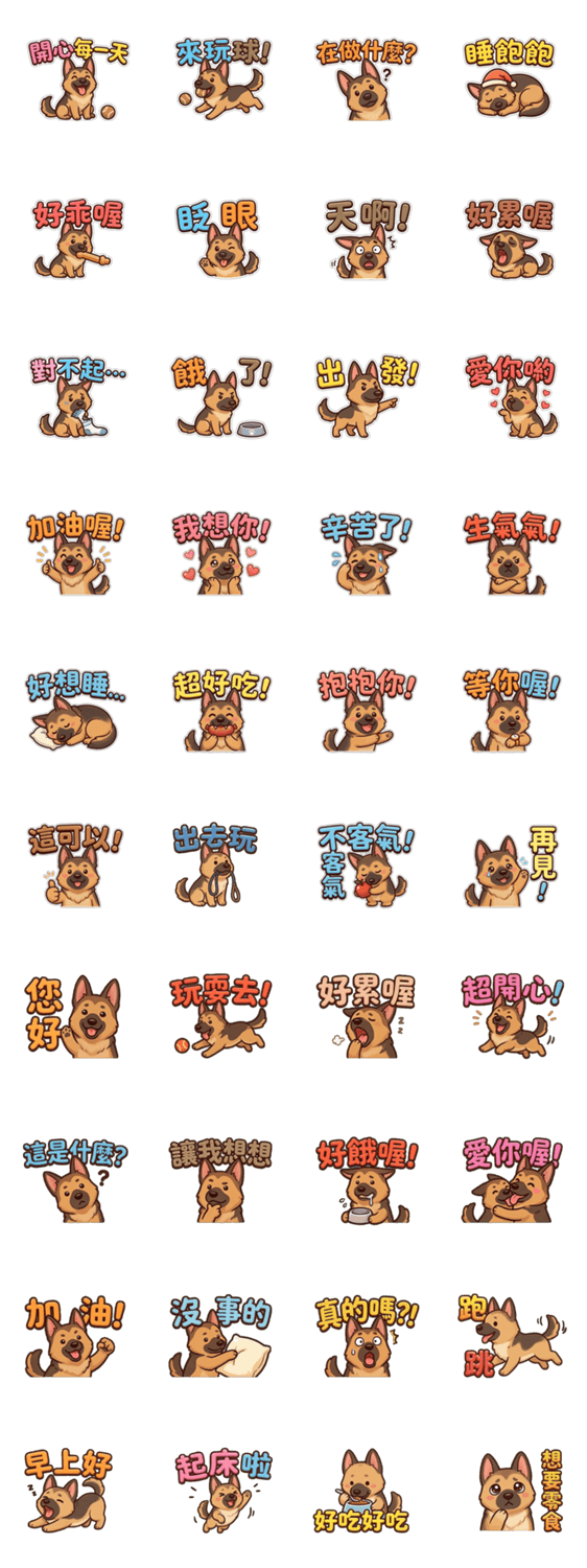 Brighten your chats with these adorable chibi German Shepherd stickers! Featuring cute expressions and daily greetings, perfect for dog lovers everywhere.