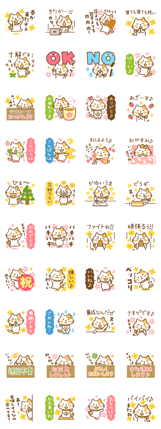 | スタンプ説明 | 茶白トビ猫のねこ田さんの日常で使いやすいシンプルなスタンプの春版が出来ました。ねこ田さんと一緒に春の季節を過ごしてくださいね。 |