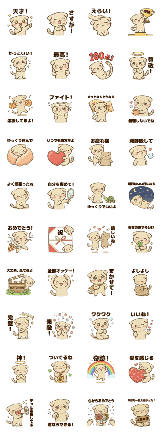 癒やし系ねこ「きいにゃ」のスタンプ第3弾!「えらい!」など褒め言葉を集めた40種類。ゆるい表情で毎日のトークを楽しく癒やします!