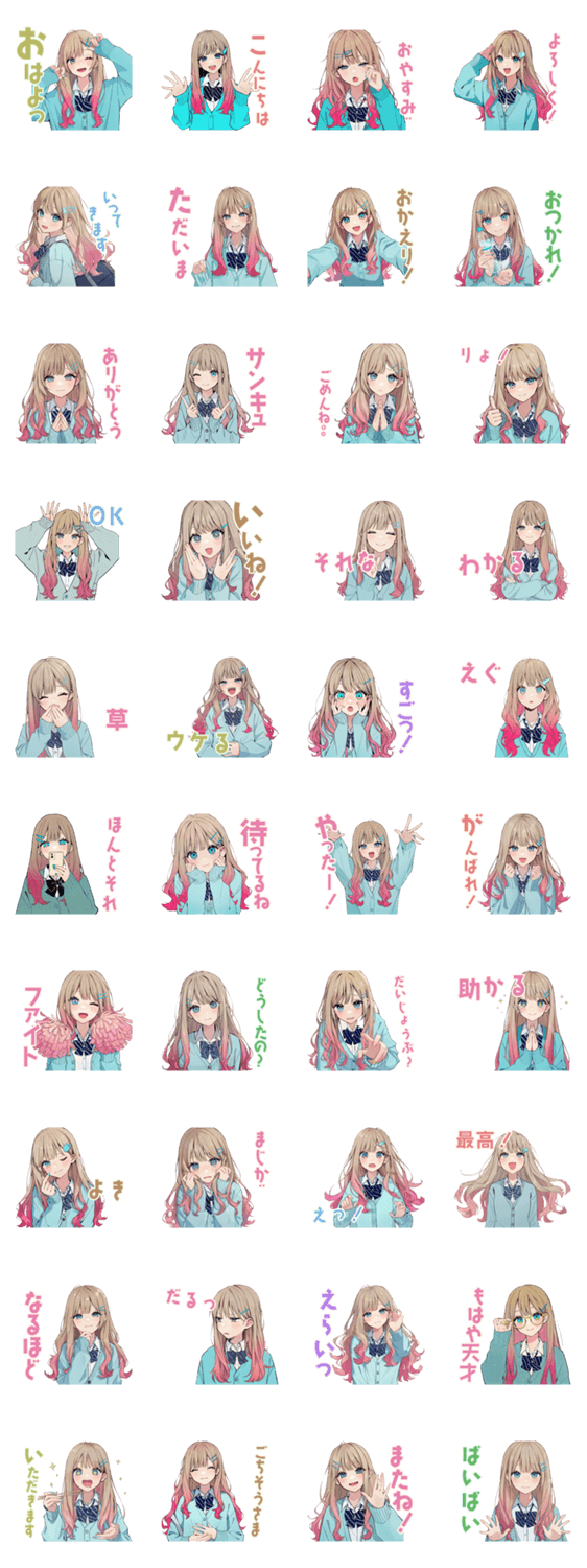 ヘアピンを付けた女子学生のスタンプ。友達との会話等に!/挨拶/日常/毎日/かわいい/シンプル/ゆる/ほのぼの/友達/女子/学生/JK/ポップ/普段使い/癒し