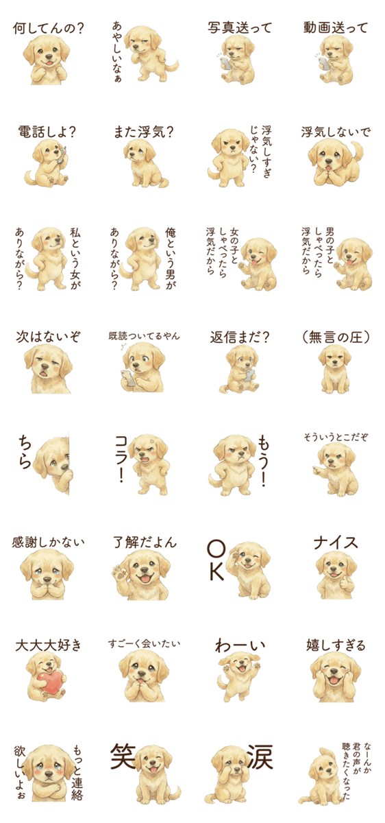 恋人に嫉妬するかまってちゃんな子犬スタンプです。恋人や友達に甘えたいときに。 (犬,ゴールデンレトリバー,友達,彼氏,彼女,カップル,恋人,甘えん坊,癒し系,嫉妬,束縛)
