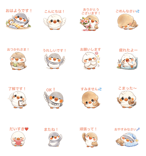 ふんわり可愛いキンカチョウのスタンプです。 あいさつや日常会話で使いやすい言葉を集めました。 毎日使える癒し系スタンプです。