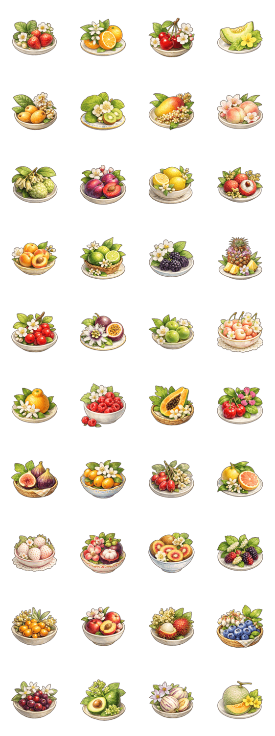 果実と可憐な果実花が彩る世界(果実/果実花/フルーツ/花/春/いちご/さくらんぼ/びわ/キウイ/マンゴー/桃/レモン/メロン/柑橘/可愛い/ライチ/すもも/プラム/マンゴスチン)