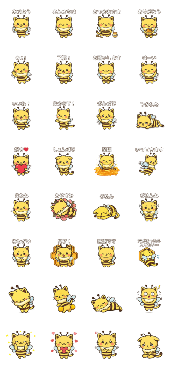 蜂と猫が合体したキャラクター「ぶんにゃん」の日常スタンプです。 挨拶を中心に毎日のトークで使いやすい32個セット。 ほっこり可愛いぶんにゃんが会話を盛り上げます。