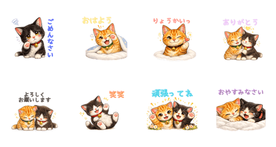 茶トラの諭吉とハチワレの大吉のかわいい日常スタンプです。挨拶やリアクションに使えます。