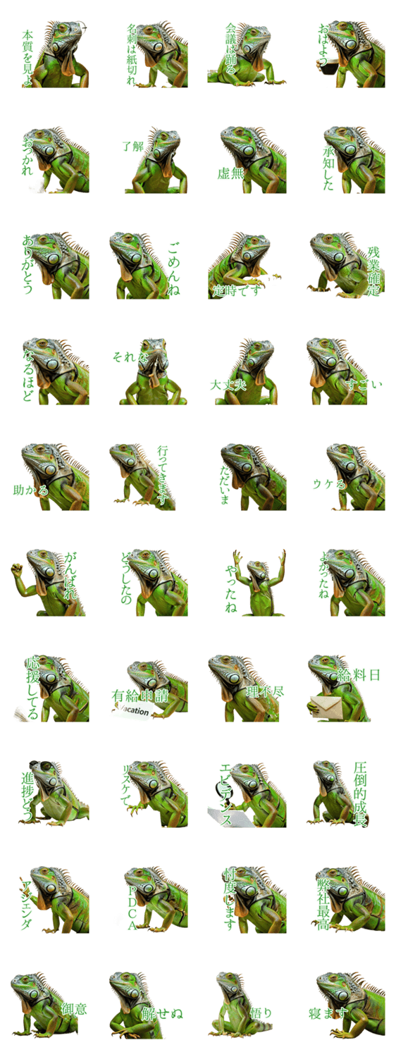 | スタンプ説明 | 宇宙の真理を『哲学するイグアナ』が説く。新社会人やビジネスマンへ贈る、本質的でシュールな仕事スタンプ。忖度、PDCA、虚無な日常や挨拶にも使えます。 |