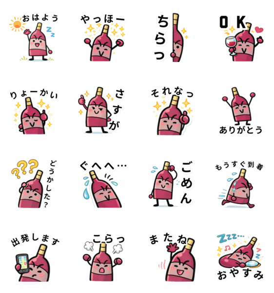 | スタンプ説明 | ゆるくてちょっと大人なワインボトル「いきなりワイン」。毎日のトークをゆるく楽しくしてくれる日常スタンプ。 |