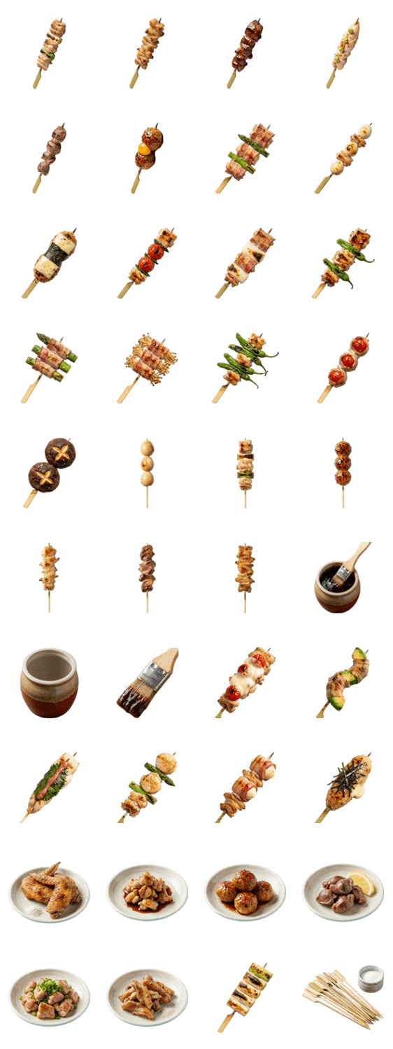 写真風 リアル 食べ物 グルメ 居酒屋 和食 日本料理 鶏肉 串焼き 香ばしい おいしい ごはん おつまみ 夜ごはん ナチュラル 人気 トーク用 LINEスタンプ 食欲そそる 美味し
