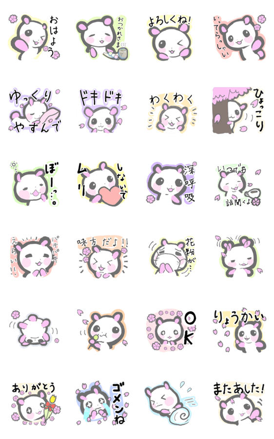 | スタンプ説明 | 春の桜風に吹かれる、ふんわり優しいパンダのスタンプ24種類。誰とでも使いやすいデザインを揃えました。新生活の始まりや、楽しい気持ちをパンダと一緒に送り合ってね |