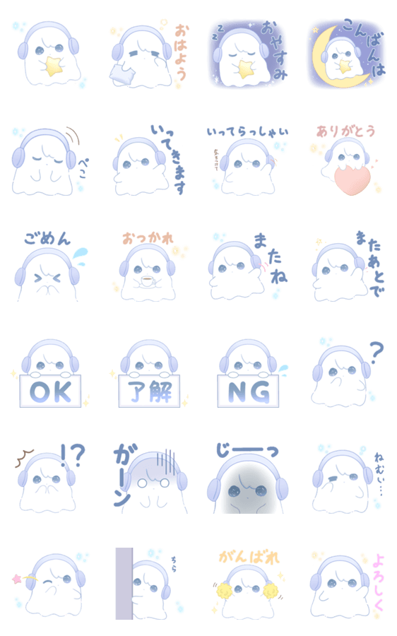ヘッドホンをつけたかわいいおばけの、ゆるくて使いやすい日常スタンプです。あいさつやリアクションが入っていて、毎日使えます♪