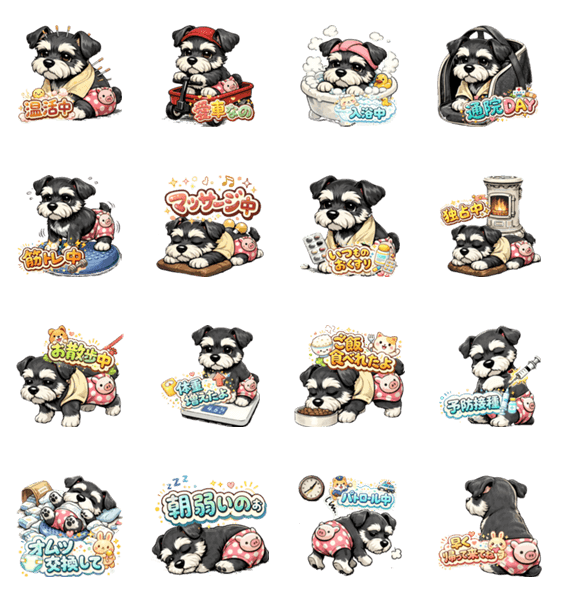 ゆっくりでも前向きに。がんばるシニアシュナの日常を、やさしくコミカルに描いたスタンプです。無理しないけど止まらない、小さな一歩を応援します。