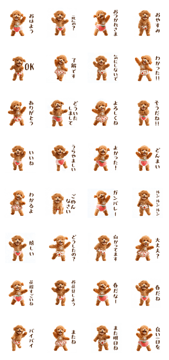 いちごのパンツをはいたトイプードルのおもしろかわいいスタンプ。春のトークを楽しく盛り上げる、ほんわか癒し系のスタンプです♪